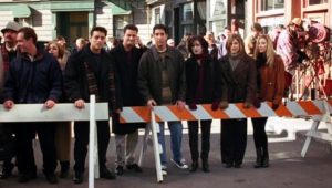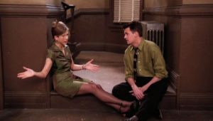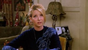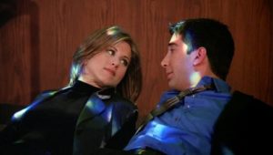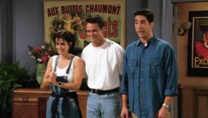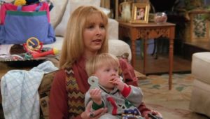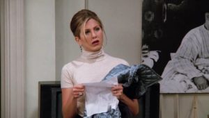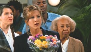 Ross’s ex and her lesbian lover tie the knot, providing Monica with a job: catering the wedding. Phoebe is possessed by the spirit of an eighty-two year old massage client who dies in the middle of a session. Mrs. Adelman cannot depart until she’s “seen everything” (needless to say, her spirit departs after the lesbian wedding). And Rachel’s mom comes to visit and drops a bombshell: she’s getting divorced from Rachel’s dad.